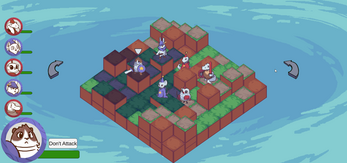 In this tactics game, you play with a guinea pig, a rat and a rabbit, protecting themselves from a snake, alligator and a owl. The game has a fixed turn order, always changing between teams and with a turn consisting of a move and attack phase, both skippable.